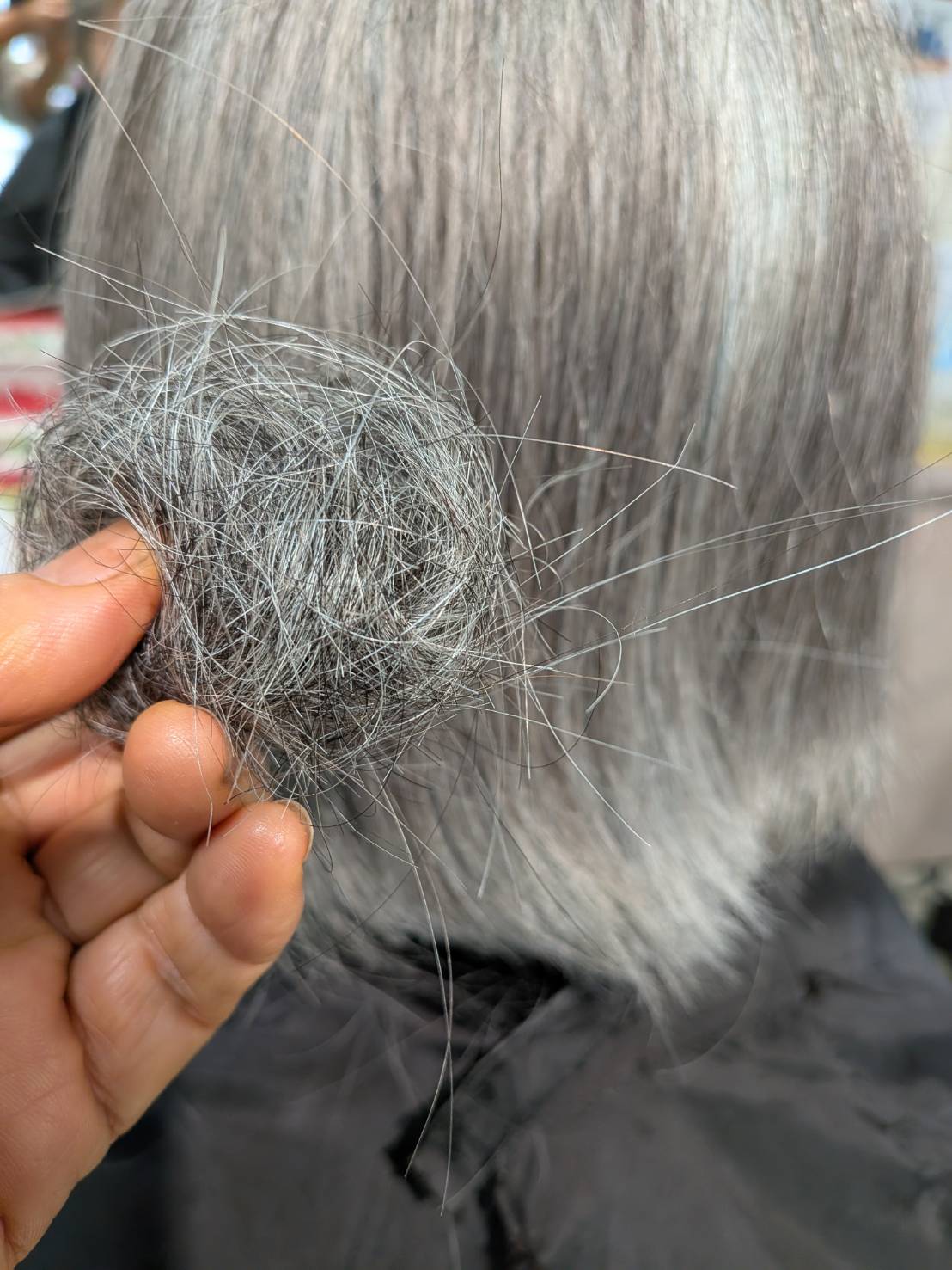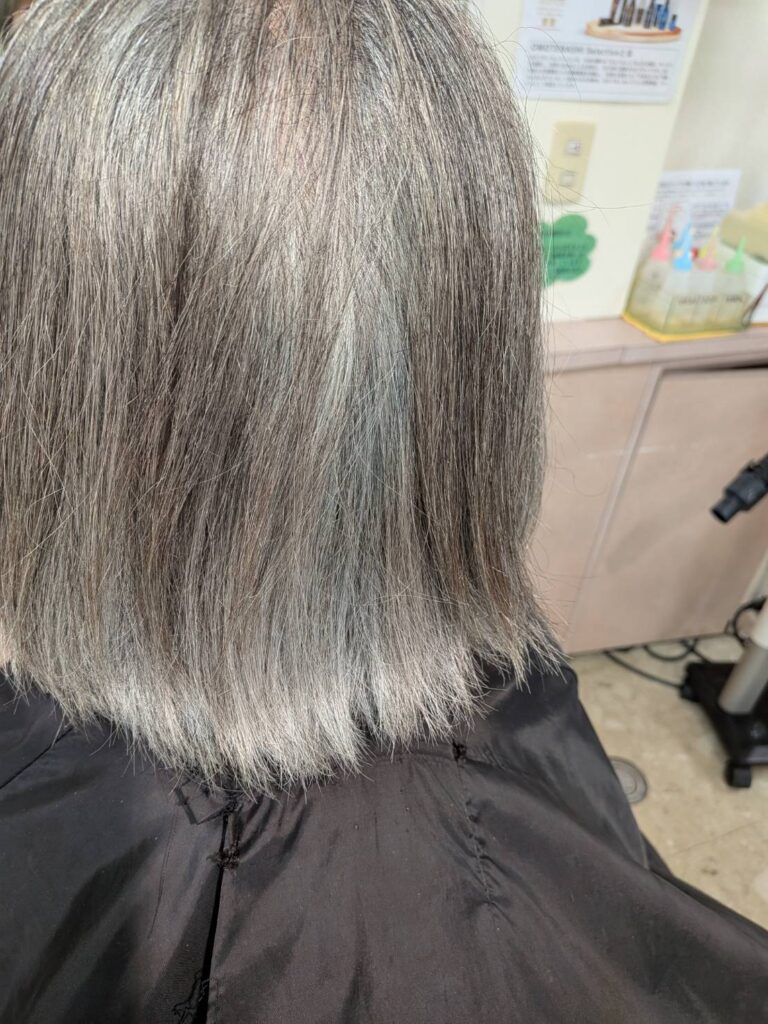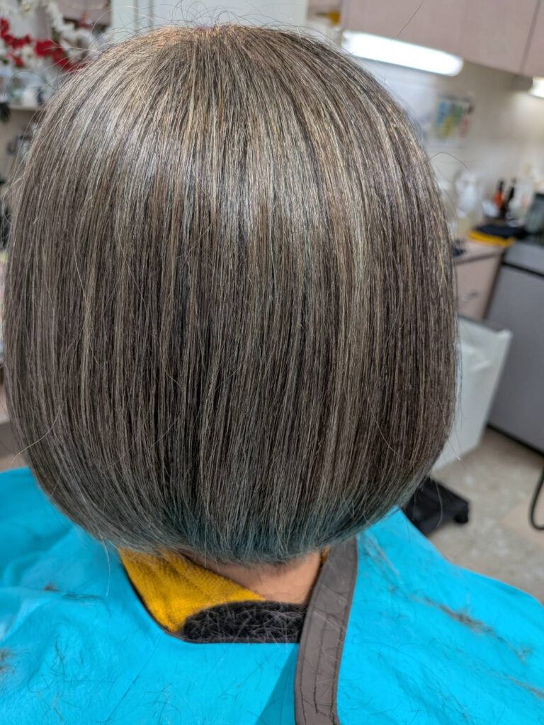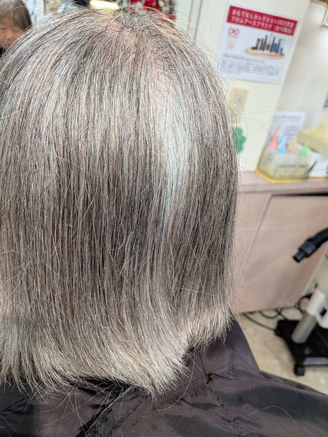 退色したとはいえプラチナグレーもまんざら悪く無いでしょう! リセッターかけましたら艶がよみがえりましたね! ショコラベージュカラーがしっくり、カットラインも素敵に整いました、ほんと!お似合いですね