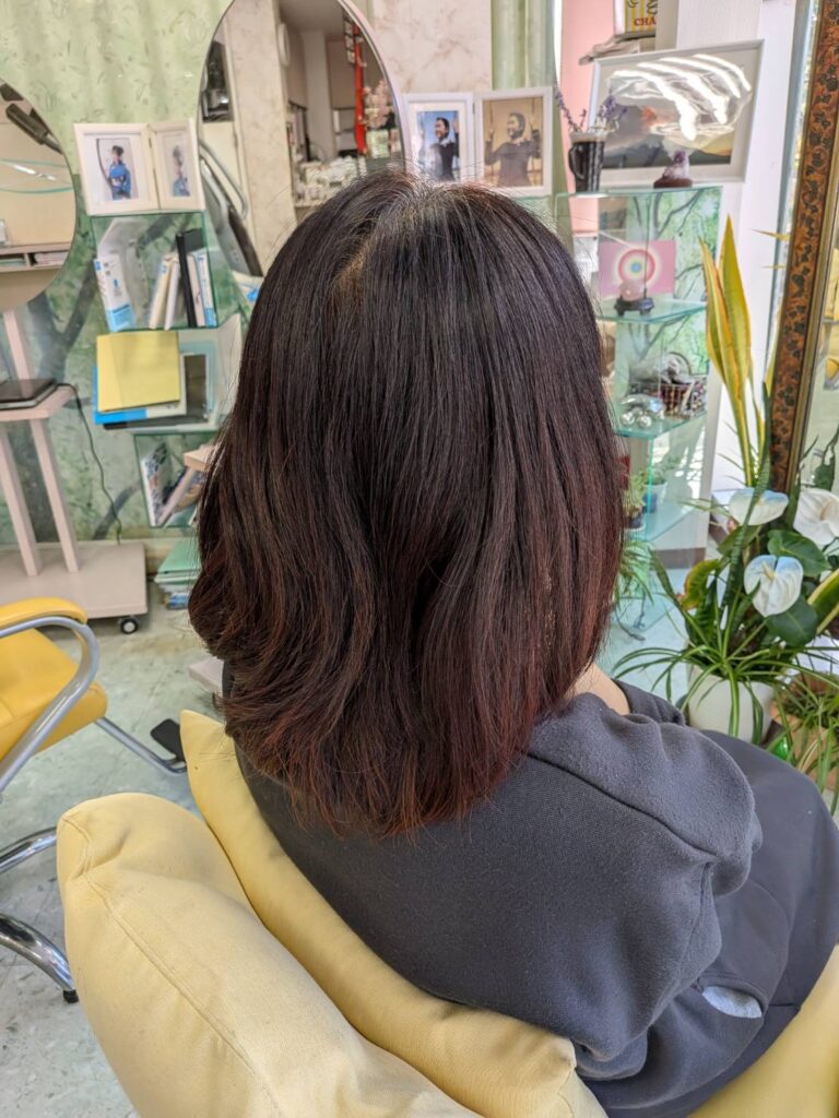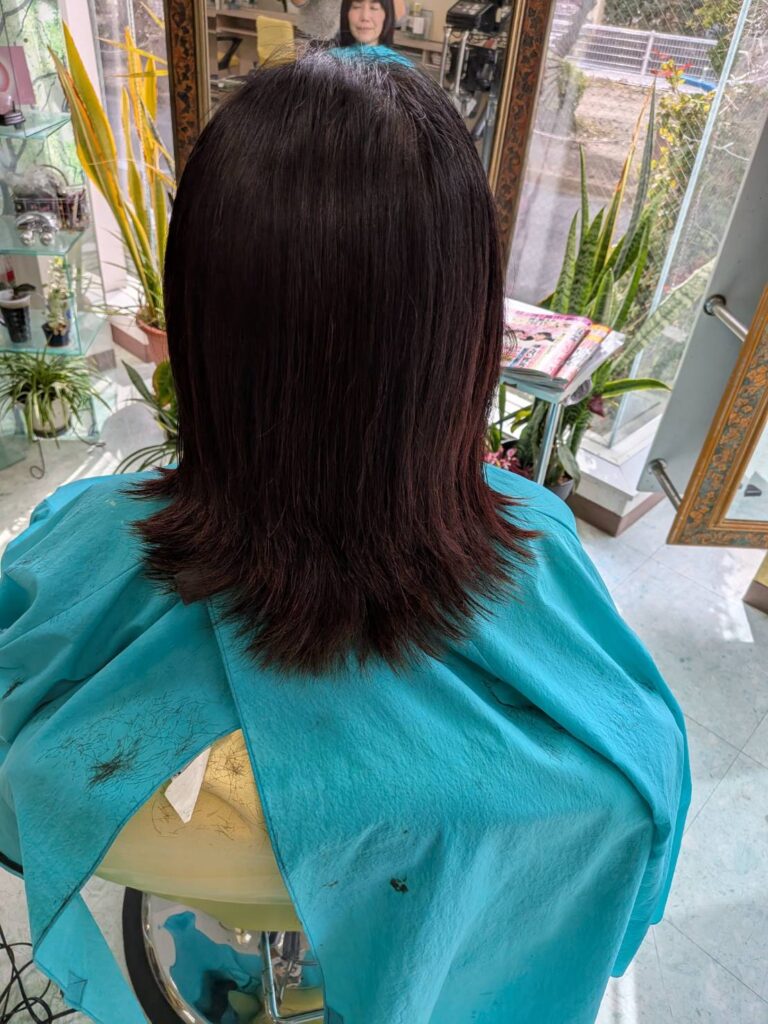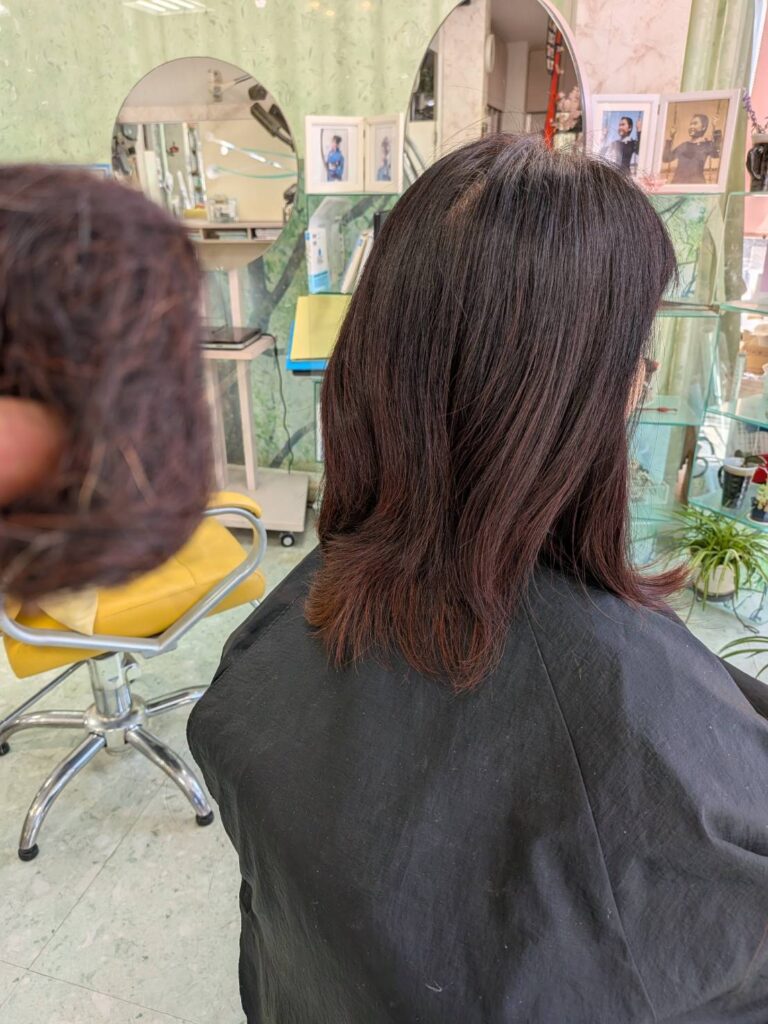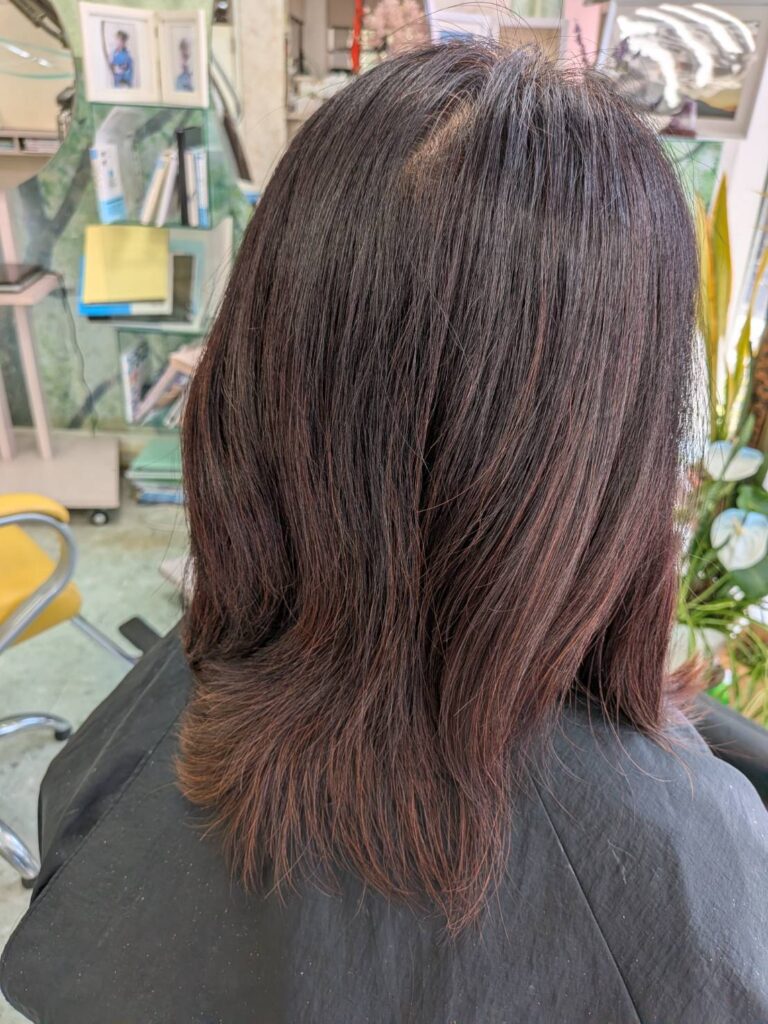 仕上げは、毛先をトリミングカットで修正、カラーは、パートナオリジナルカラーで完成、仕上げにアイロンを使いたくないご希望で、テラヘルツブラシでとかし、ブローで仕上げました、後のお手入れに特別なテクニックを施さない美しさが今回のテーマです!大満足!モデル様も、私、内海も。