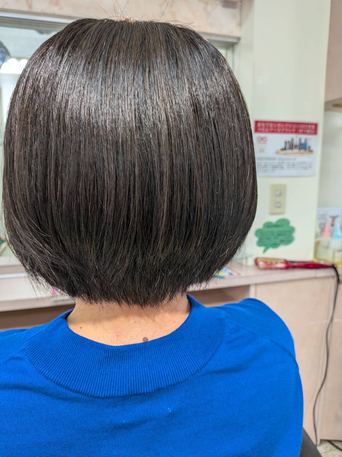 施術前 リセッター後 わかりますか?シャンプー無しで仕上げましたがリセッターカットの効力で艶がバッチリ。 4〜5回目のリセッターなので、シルエットは小 …