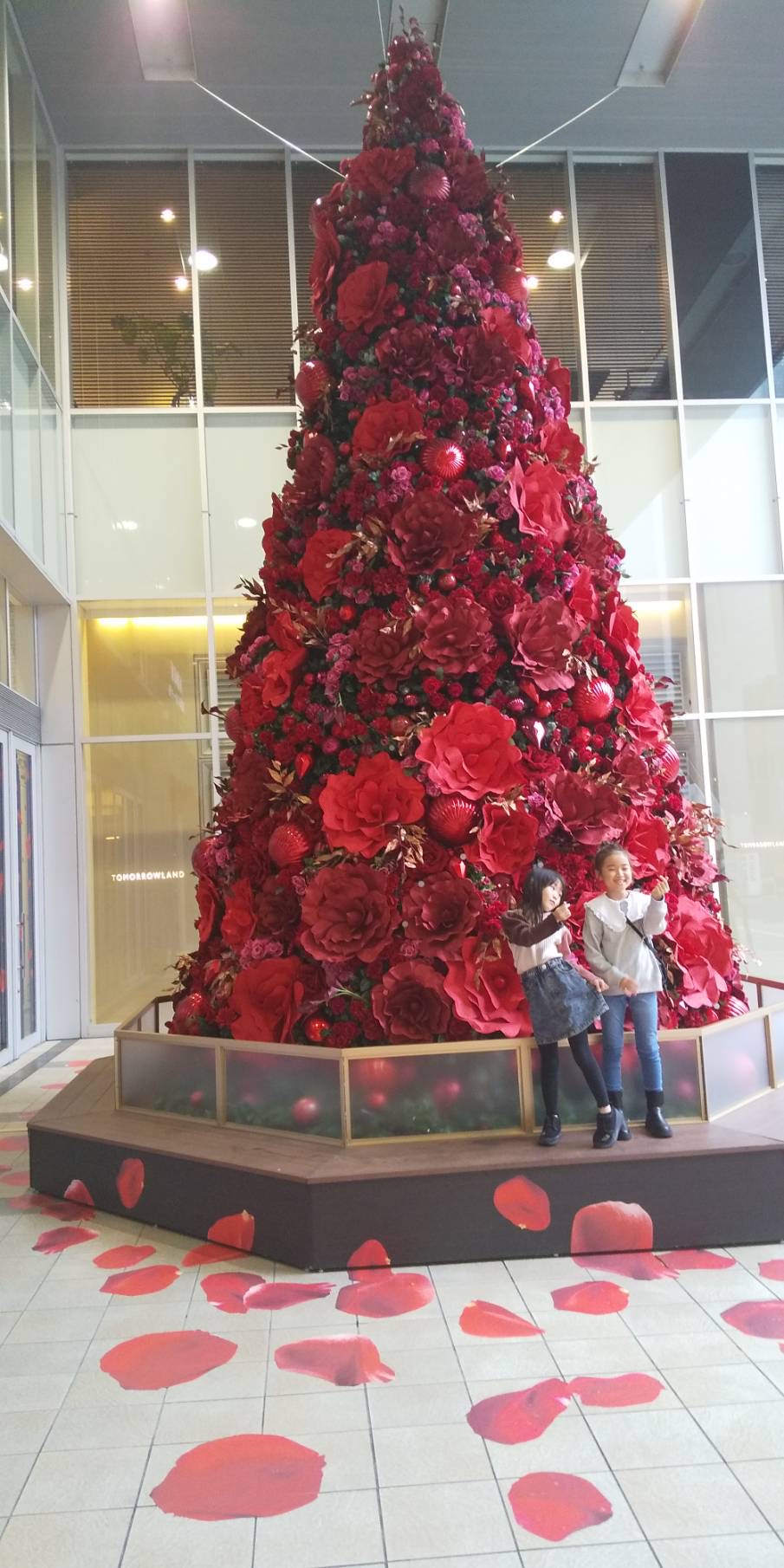 セノバ南側入口のクリスマスツリーが、赤いフラワーで、見上げる程の大きさで、思わず童心が沸き上がり、写真を撮らせて頂きました❗️ 可愛いお子さんの背丈で、いかにツリーが大きいか⁉️ お分かりですね🎵